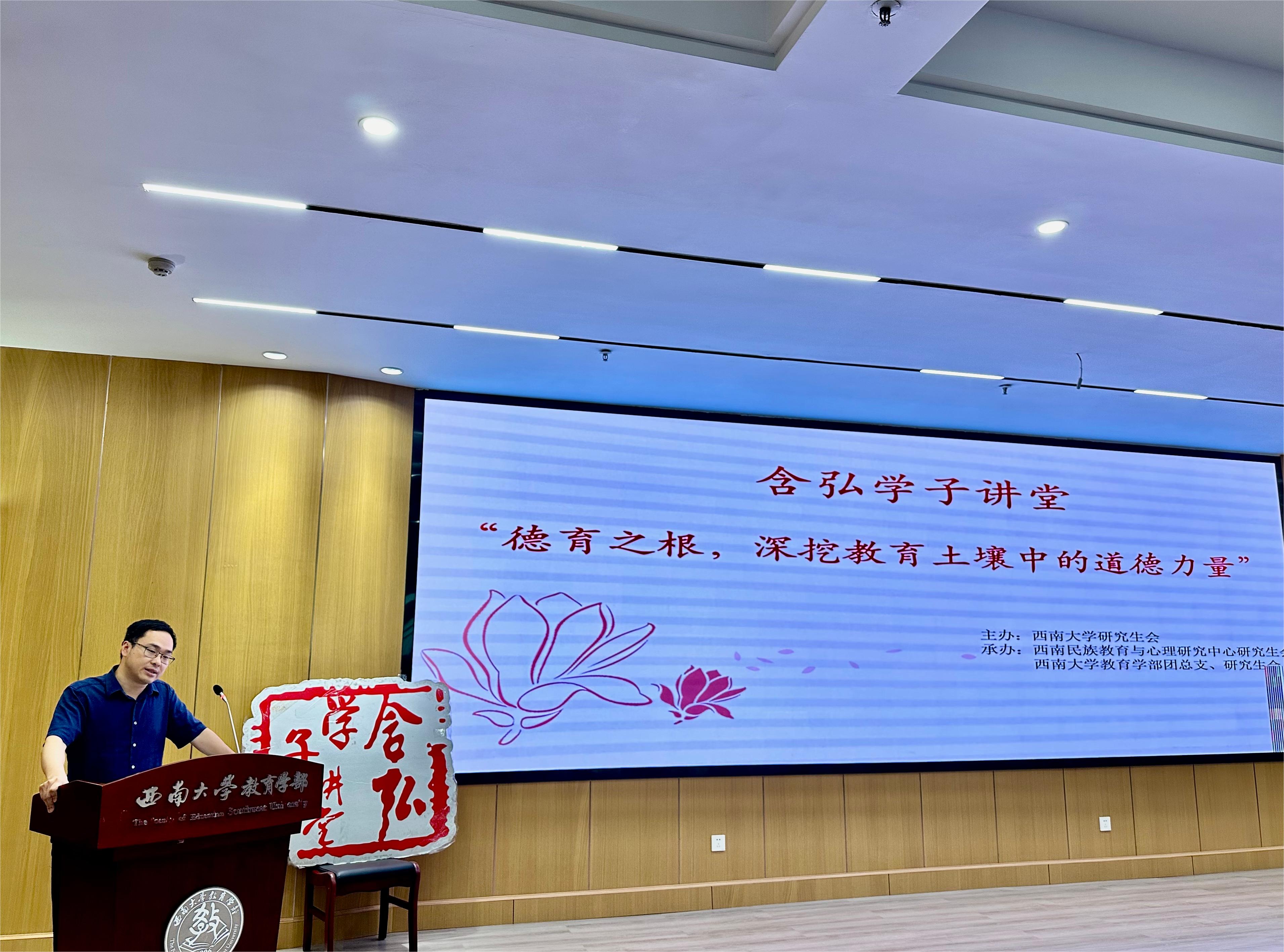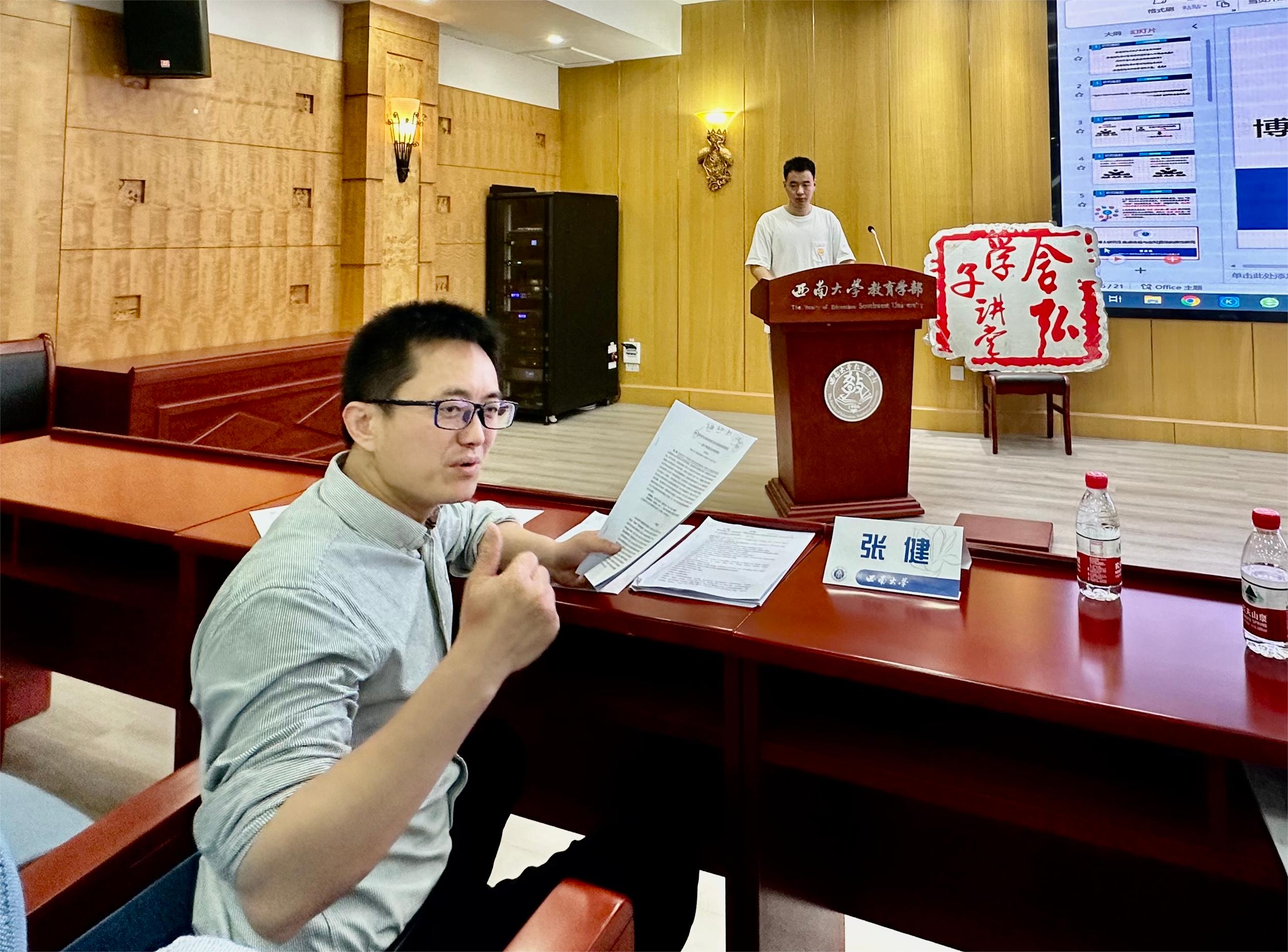 为深入学习贯彻党的二十大精神,促进西南大学研究生之间的交流互访,提高研究生学术科研质量,2024年5月11日,由西南大学研究生会主办,必赢优惠y272net(以下简称“中心”)和必赢优惠y272net部联合承办的含弘学子讲堂之“德育之根,深挖教育土壤中的道德力量”主题交流分享会在田家炳教育书院802报告厅举行。本次活动邀请段欣宇、铁必杰、卞慧敏、曹渡帆四位研究生作主题报告,邀请必赢优惠y272net部吴叶林副教授、杨柳副教授和中心张健副教授担任点评嘉宾,必赢优惠y272net部研究生会、中心研究生会以及两院部分研究生参加活动。