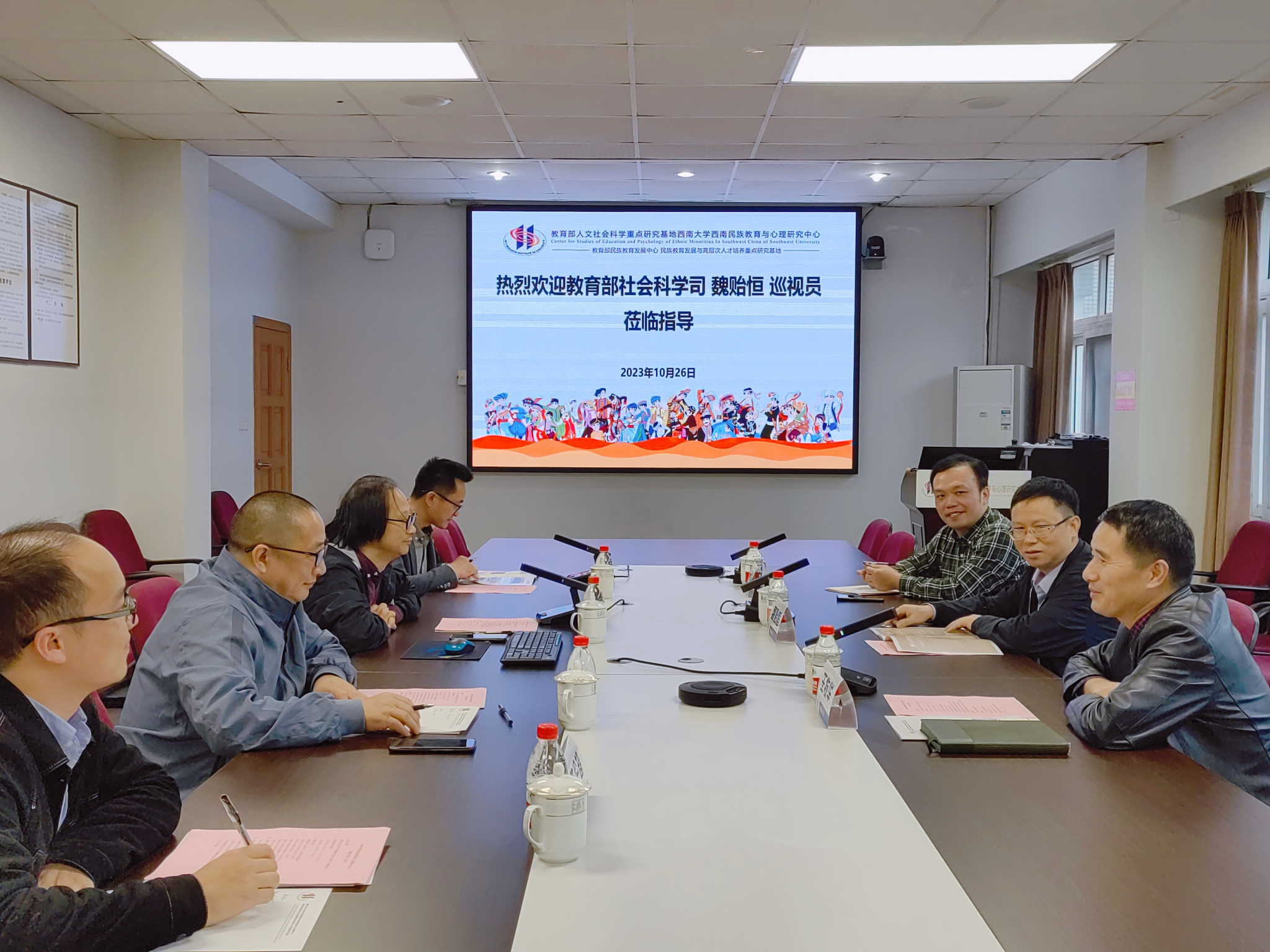 根据教育部相关工作安排,10月27日下午,教育部社科司二级巡视员魏贻恒同志带队调研教育部人文社会科学重点研究基地西南大学必赢优惠y272net(以下简称“中心”)的建设工作。学校社会科学处处长王牧华教授,中心主任张学敏教授,学校期刊社副社长吴淑爱同志,中心副主任蒋立松研究员、张健副教授参加调研工作会。会议由王牧华处长主持。