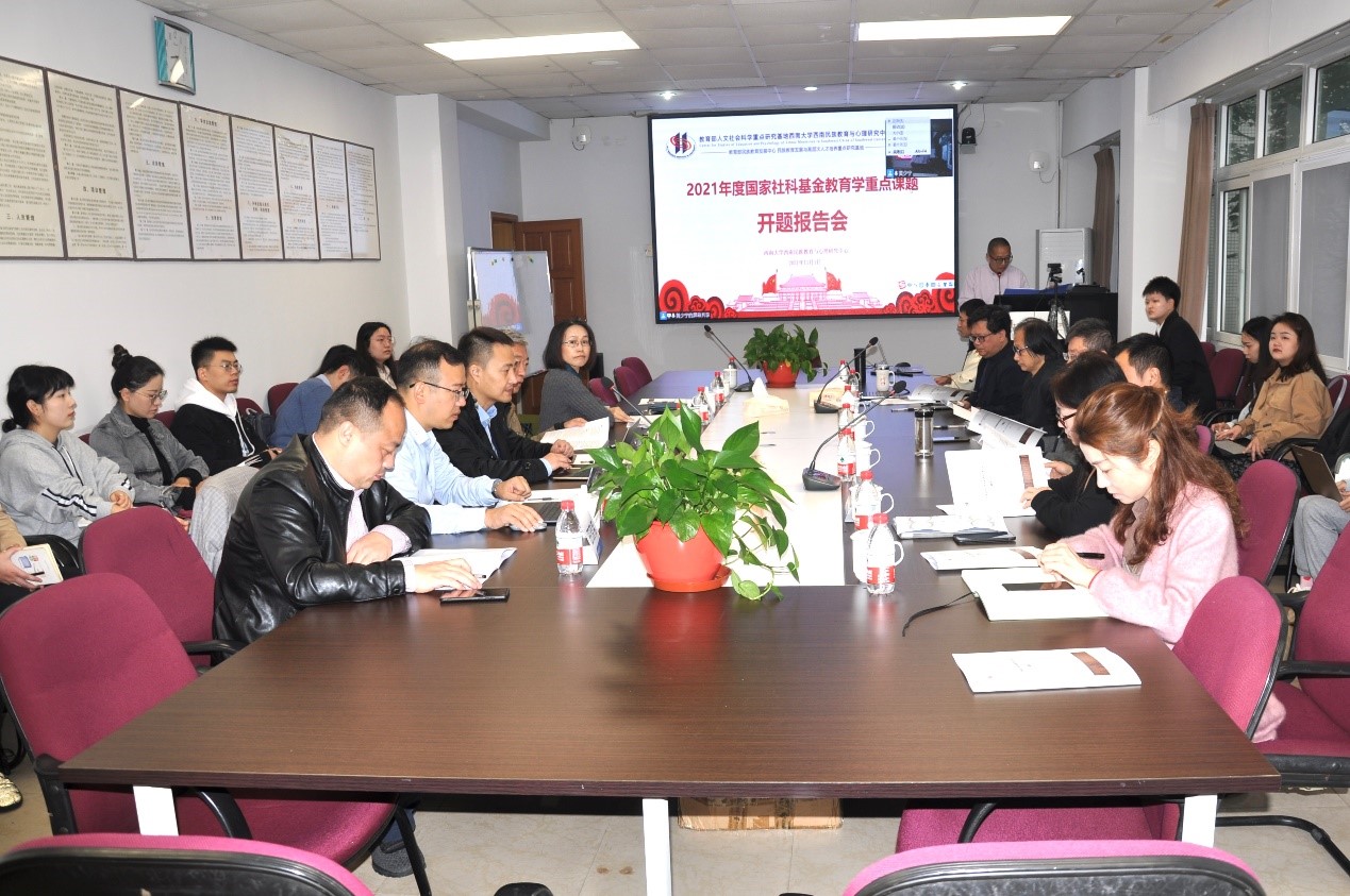 会议采取线上和线下相结合的方式;线下会议在西南大学荟文楼537会议室举行,由西民中心副主任蒋立松研究员主持。来自华东师范大学、华中师范大学、西北师范大学、四川师范大学、新疆师范大学、河南大学等专家、学者、教育行政官员、中小学教师以及课题组成员,总计约110人参与了会议。