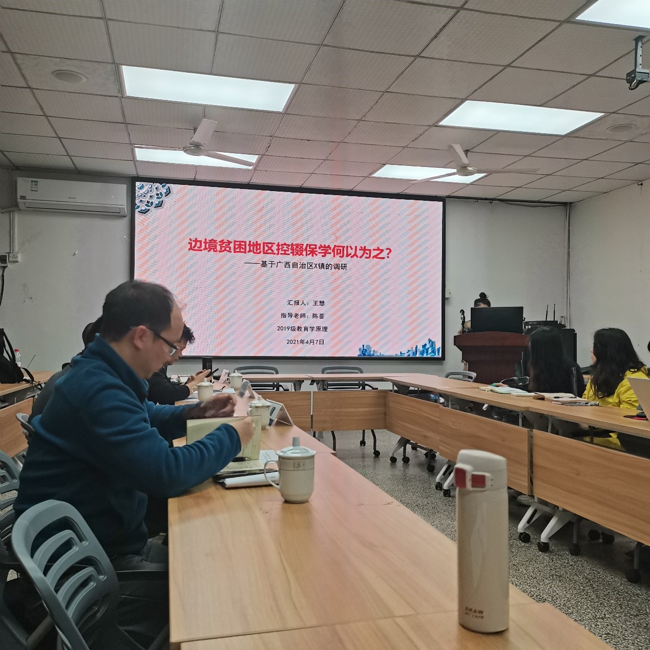 在评选会的汇报环节,共有1位博士生和7位硕士研究生发言。周杰、程紫嫣、蒋丹、王明慧、王慧、吴燕君、王红玉、郭血峰分别就“重庆实现教育现代化2035奋斗目标”“多民族学校各族学生交往中的民族身份与文化认同”“遏制理论视角下辍学与保学之间的博弈”“边境民族地区乡村小规模学校发展”“广西边境地区控辍保学”“边境地区外籍学生教育问题”“一带一路倡议与职业技术学校国际化办学”等主题,向与会者汇报了各自的田野考察成果。