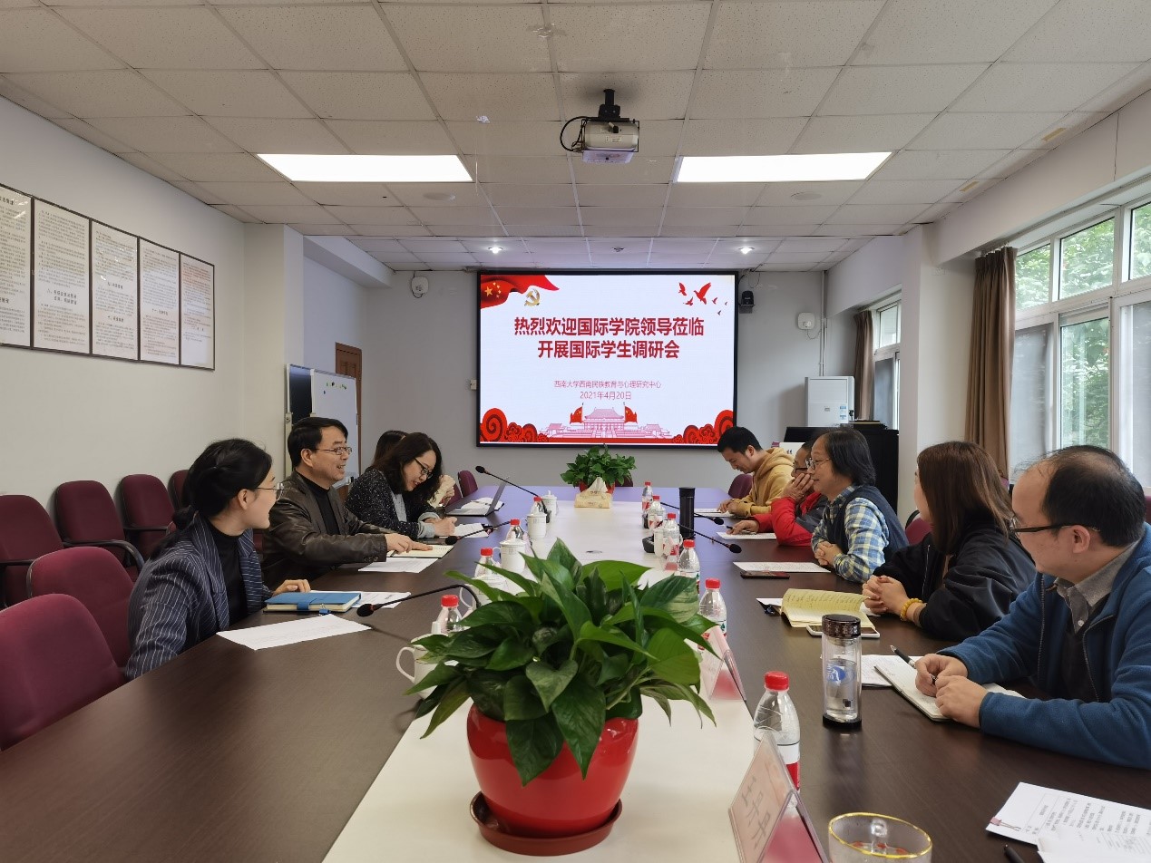 4月20日下午,西南大学国际学院副院长张家政、招生办宋格格、教学办杨凌霄、学生工作办景柯沥一行莅临必赢优惠y272net(以下简称“中心”)调研国际学生培养和管理工作。中心主任张学敏主持工作交流会,中心学术主任助理蒋立松、综合办主任李彤、培养办主任陈伦超、外事秘书谭亲毅等同志参加了此次会议。