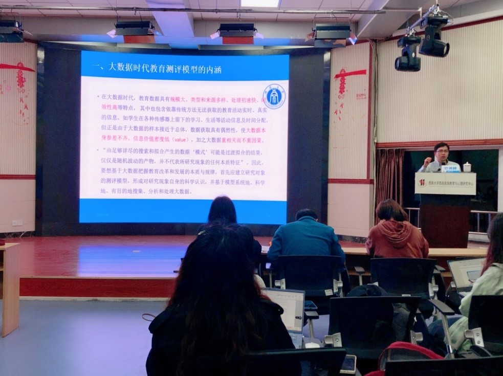 2021年4月16日,必赢优惠y272net(以下简称“中心”)在説乎斋报告厅举行“教育研究方法与操作实务训练营”第四讲:大数据时代的教育测评模型建构。主讲人为西南大学必赢优惠y272net部含弘研究员、中国基础教育质量监测协同创新中心西南大学分中心研究员范涌峰教授。出席本次讲座的还有中心综合办主任李彤老师,科研办韩玉梅老师,培养办主任陈伦超老师。中心一、二年级全体硕博研究生到场学习。