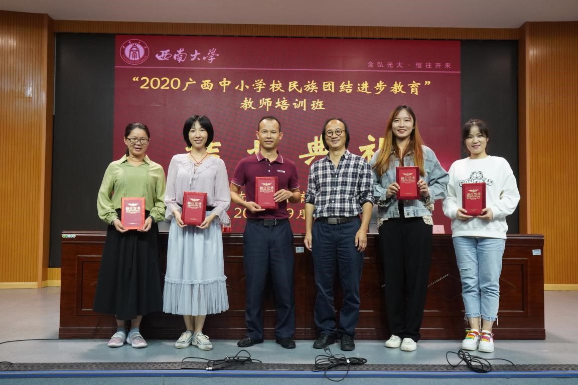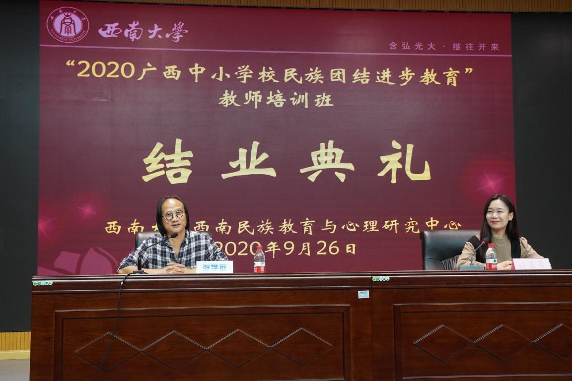 9月22-26日,2020年广西中小学校民族团结进步教育教师培训班在教育部人文社科重点研究基地西南大学必赢优惠y272net(以下简称“中心”)举办。该培训工作由广西壮族自治区教育厅主办,广西民族大学、西南大学共同承办。9月23日上午,培训班在西南大学大学生创新创业中心202报告厅举行隆重的开班典礼。经过为期四天的培训学习,9月26日下午,培训班在西南大学第三十一教举行了结业典礼。