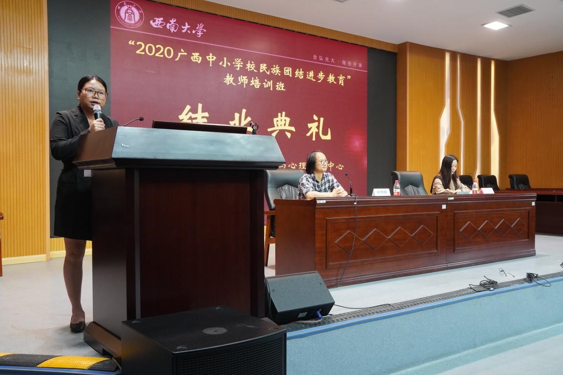 结业典礼上,中心主任张学敏对来参加此次培训的广西壮族自治区各中小学校教师表示衷心的感谢。广西壮族自治区防城港市东兴市京族学校黄小霞老师作为学员代表发言,对培训期间的学习体验和收获进行了总结分享,并表达了对全体培训专家和工作人员的感谢。2020年广西中小学校民族团结进步教育教师培训圆满收官。