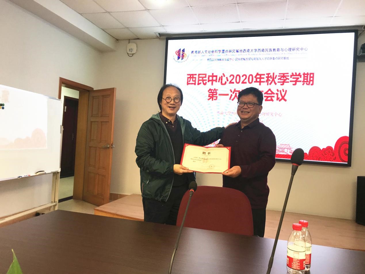 会议结束后,中心主任张学敏教授对中心秋季学期工作进行了部署,同时聘罗江华教授为中心副主任,并为其颁发聘书。张学敏教授再次强调了本学期工作的重点及难点,鼓励大家迎难而上,积极努力做好教育部对基地的评估工作。