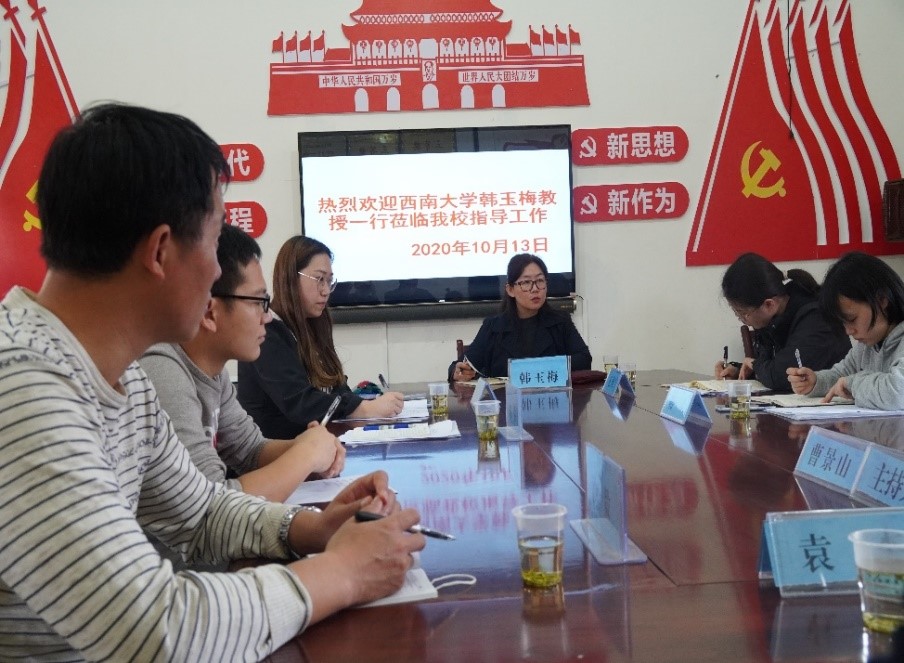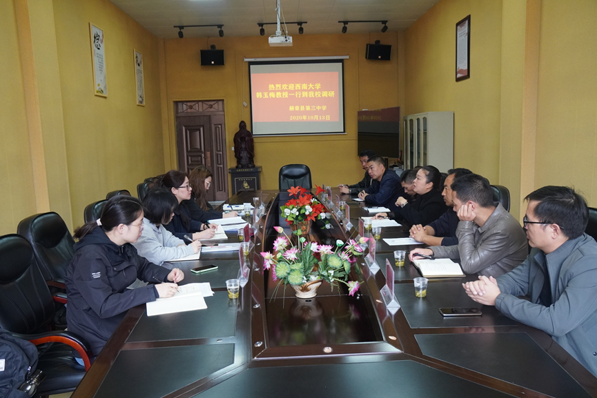 10月13日上午,在贵州省赫章县教育科技局领导陪同下,西南大学必赢优惠y272net副研究员韩玉梅带领调研组赴赫章县第三中学、珠市彝族乡民族初级中学开展座谈和调研。学校领导及部分一线教师参加座谈会,介绍了学校发展历程,讲述了“十三五”阶段的成就和问题,以及学校层面对“十四五”发展规划的诉求。调研组就高中集团化办学、学校信息化建设、学校寄宿问题、心理健康教育、民族文化进校园、国家通用语言教学等方面同与会领导和教师交流。座谈会结束后,调研组观摩了赫章县第三中学的“双师云课堂”及珠市彝族乡民族初级中学由彝族铃铛舞改编而成的铃铛舞课间操。