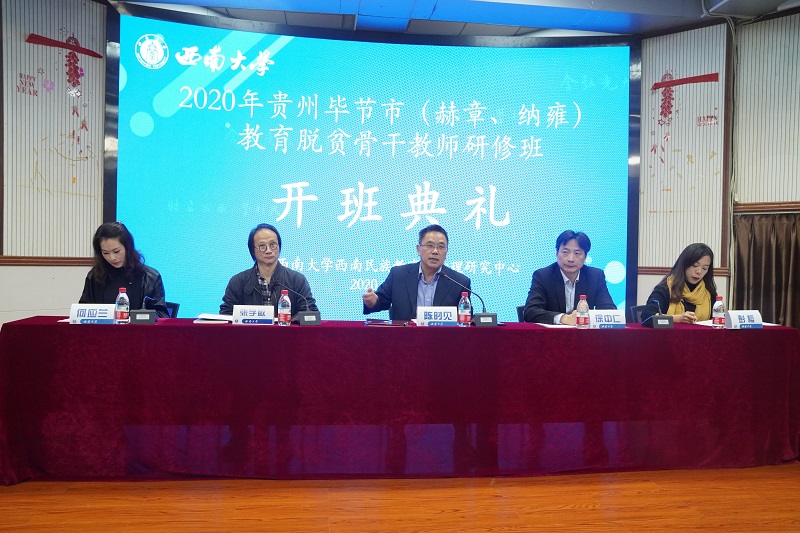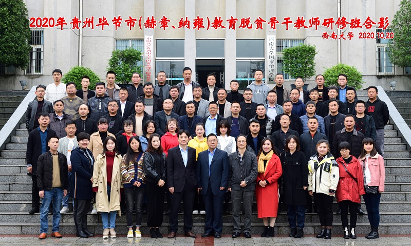 为深入贯彻落实习近平总书记决战决胜脱贫攻坚座谈会上的重要讲话精神及教育部有关助力“52个未摘帽贫困县如期脱贫”、全力以赴打赢教育脱贫攻坚战的指示,10月20日上午,2020年贵州毕节市(赫章、纳雍)教育脱贫骨干教师研修班开班典礼在西南大学说乎斋201报告厅举行。出席典礼的有西南大学副校长陈时见、西南大学社会科学处副部长徐中仁和来自赫章、纳雍县的教研老师及管理干部60余人。典礼由必赢优惠y272net主任张学敏主持。