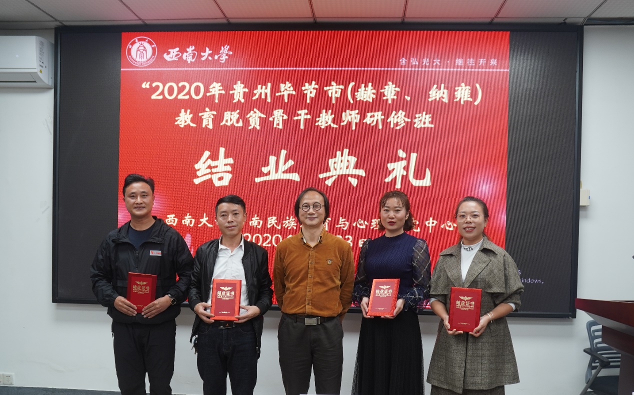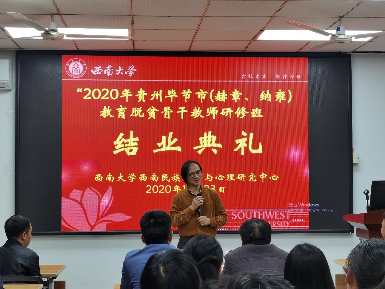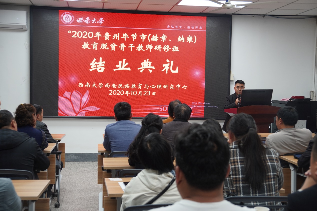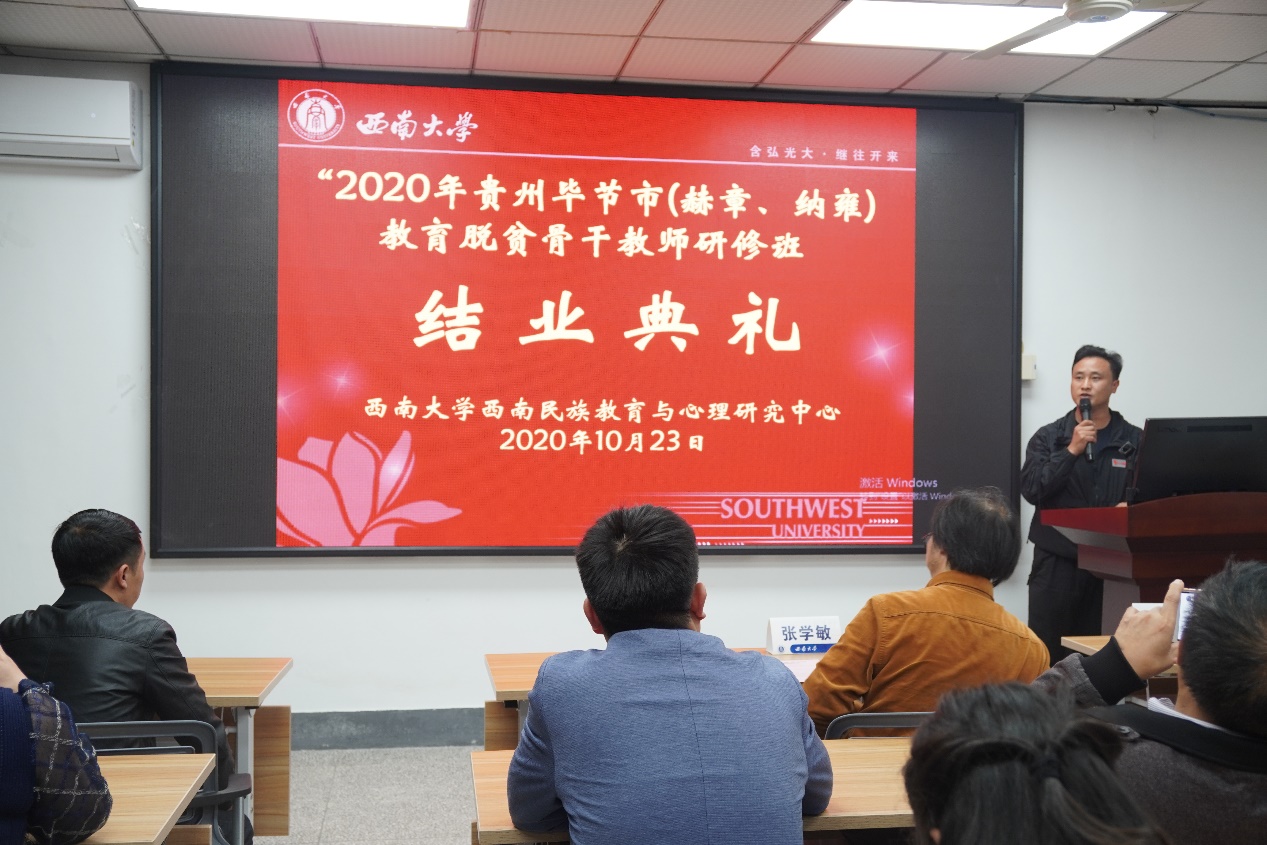 10月19-23日,2020年贵州毕节市(赫章、纳雍)教育脱贫骨干教师研修班在教育部人文社科重点研究基地西南大学必赢优惠y272net(以下简称“中心”)举行。10月23日下午,研修班结业典礼在中心说乎斋105教室举行,贵州赫章及纳雍县60余名中小学校长、幼儿园长、科研教师完成培训内容,顺利结业。中心主任张学敏教授出席结业仪式。