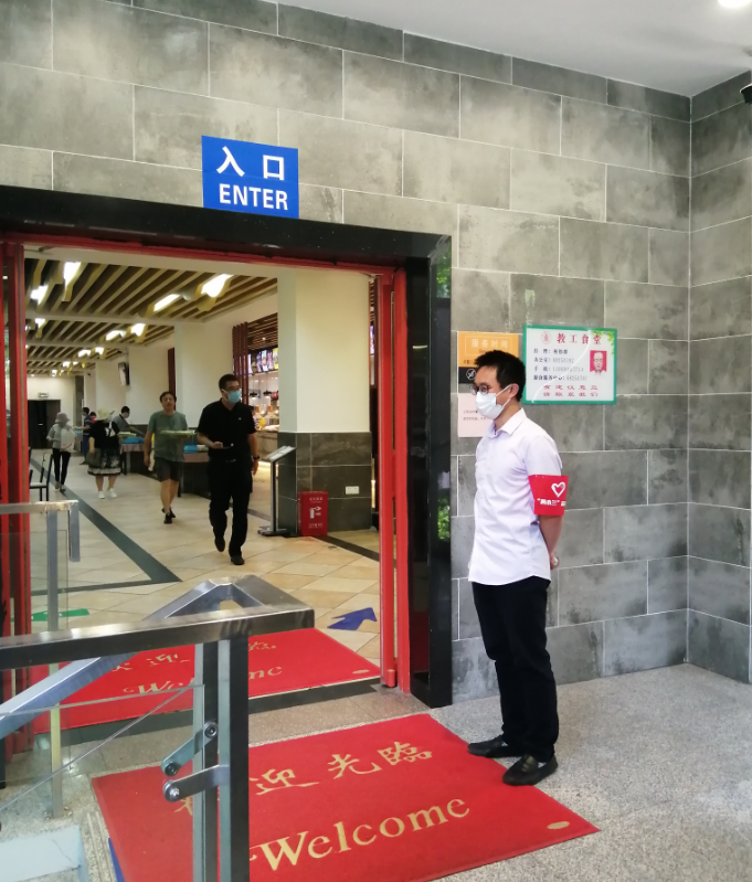 志愿服务期间,张健同志被分配在教工餐厅,负责检查和确保进入餐厅用餐的人员严格佩戴口罩,疏导用餐人员秩序,避免人群聚集;此外,张健老师还在杏园宿舍协助体温检测工作。服务过程中,感受到了很多师生投来的感激和鼓舞的眼神,让几个小时的站岗服务收获了很多感动。张健同志表示,以前对志愿者服务只停留在认知阶段,此次亲身经历才真切明白了志愿工作者的艰辛、宽容和无私。做志愿者是对自身的再认,角色的反省,心灵的净化。尤其作为教师,深入后勤一线开展志愿服务,体察基层工作者的辛苦,用实际行动为广大师生在特殊时期提供必要的健康与安全防护保障。