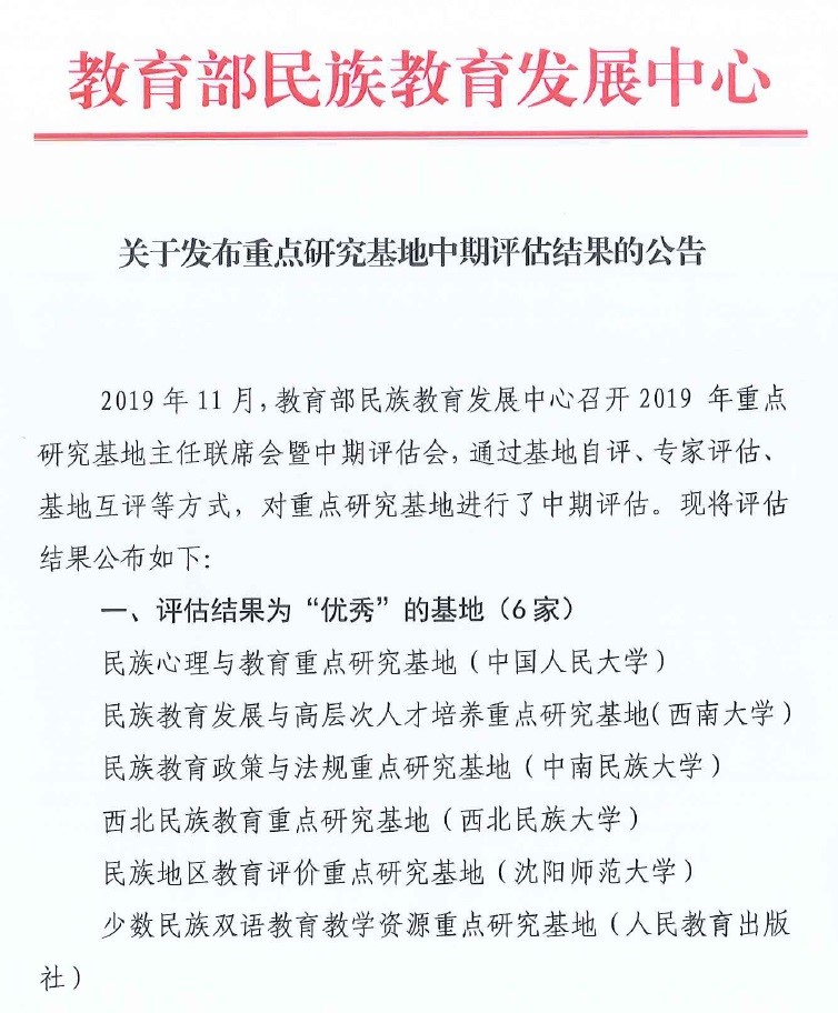 图 教育部民族教育发展中心重点研究基地中期评估优秀等级名单