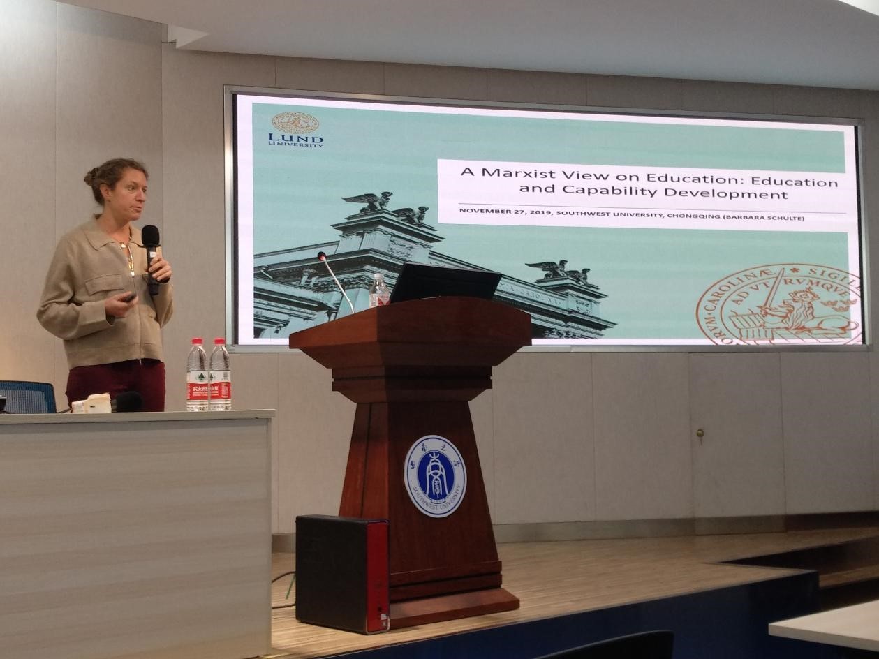 11月27日上午,由西南大学必赢优惠y272net部与必赢优惠y272net(以下简称“中心”)联合主办的“马克思主义教育思想研究”系列讲座的第三讲在田家炳教育书院811报告厅举办。本次讲座的专家为瑞典隆德大学的Barbara Schulte教授,题目为“A Marxist View on Education: Community Education and Capability Development”。必赢优惠y272net部孙振东教授担任主持,来自重庆市其他高校的师生,必赢优惠y272net部和中心的部分教师、本科生、硕博研究生参加了讲座。
