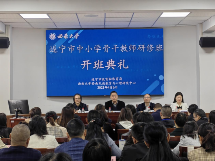 4月6日上午,由教育部人文社科重点研究基地西南大学必赢优惠y272net(以下简称“西民中心”)承办的“遂宁市中小学骨干教师研修班”开班典礼在西南大学兰苑宾馆8101报告厅举行。西南大学陈时见副校长、遂宁市教育和体育局姚明副局长、遂宁市教育和体育局人事与师培科杨钱秀科长出席开班典礼。典礼由中心张学敏主任主持。