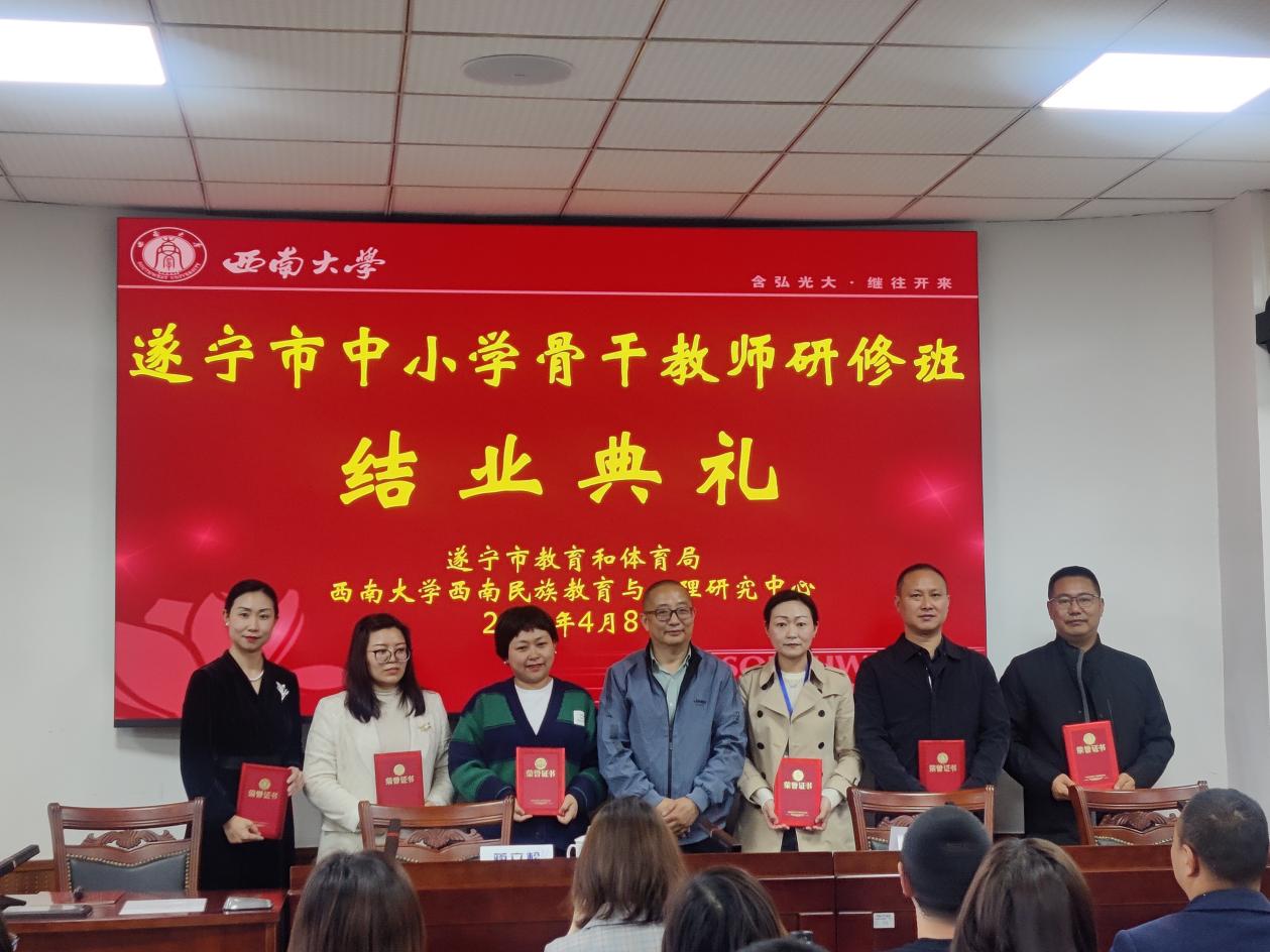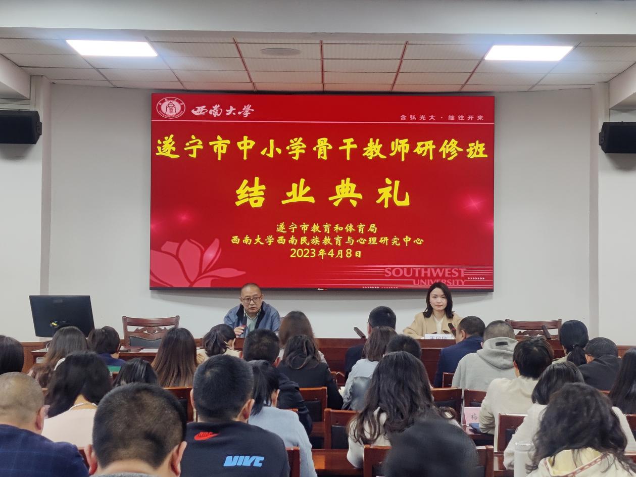 4月8日下午,“遂宁市中小学骨干教师研修班”结业典礼在西南大学兰苑宾馆8101报告厅举行,来自四川省遂宁市的90名学员完成培训内容,成绩合格,准予结业。中心副主任蒋立松教授出席典礼为学员颁发结业证书并讲话,中心综合办王丹丹老师主持。