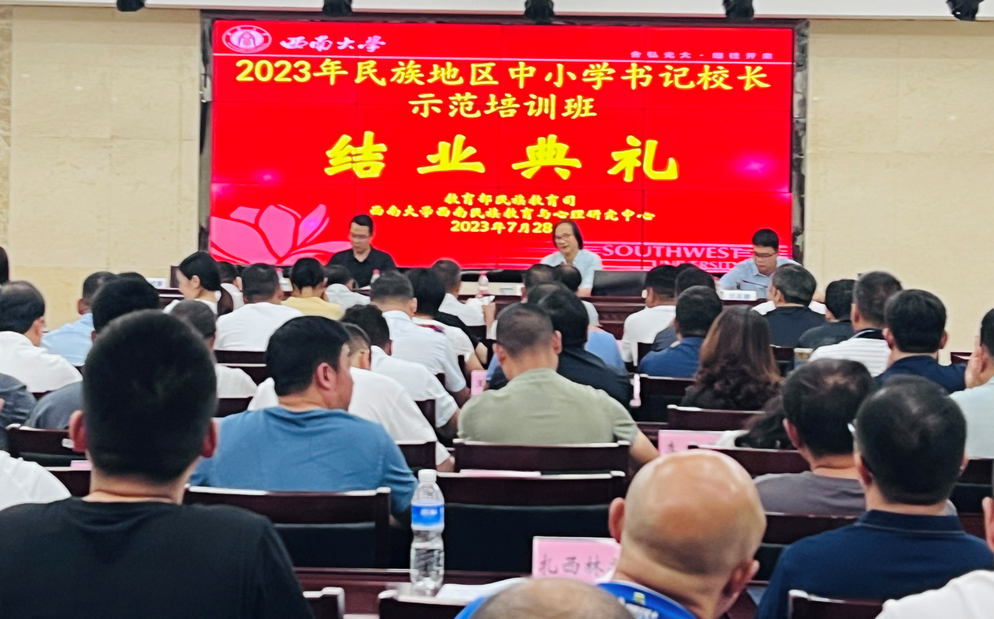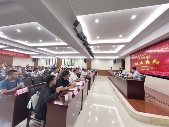 7月23—28日,由教育部民族教育司委托西南大学必赢优惠y272net(以下简称“中心”)承办的“2023年民族地区中小学书记校长示范培训班(西南片区)”圆满完成,并于28日下午举行结业典礼。中心主任张学敏教授,本次培训学员总召集人四川省汶川中学校长罗建军同志出席结业典礼,中心综合办兰正彦老师主持典礼。