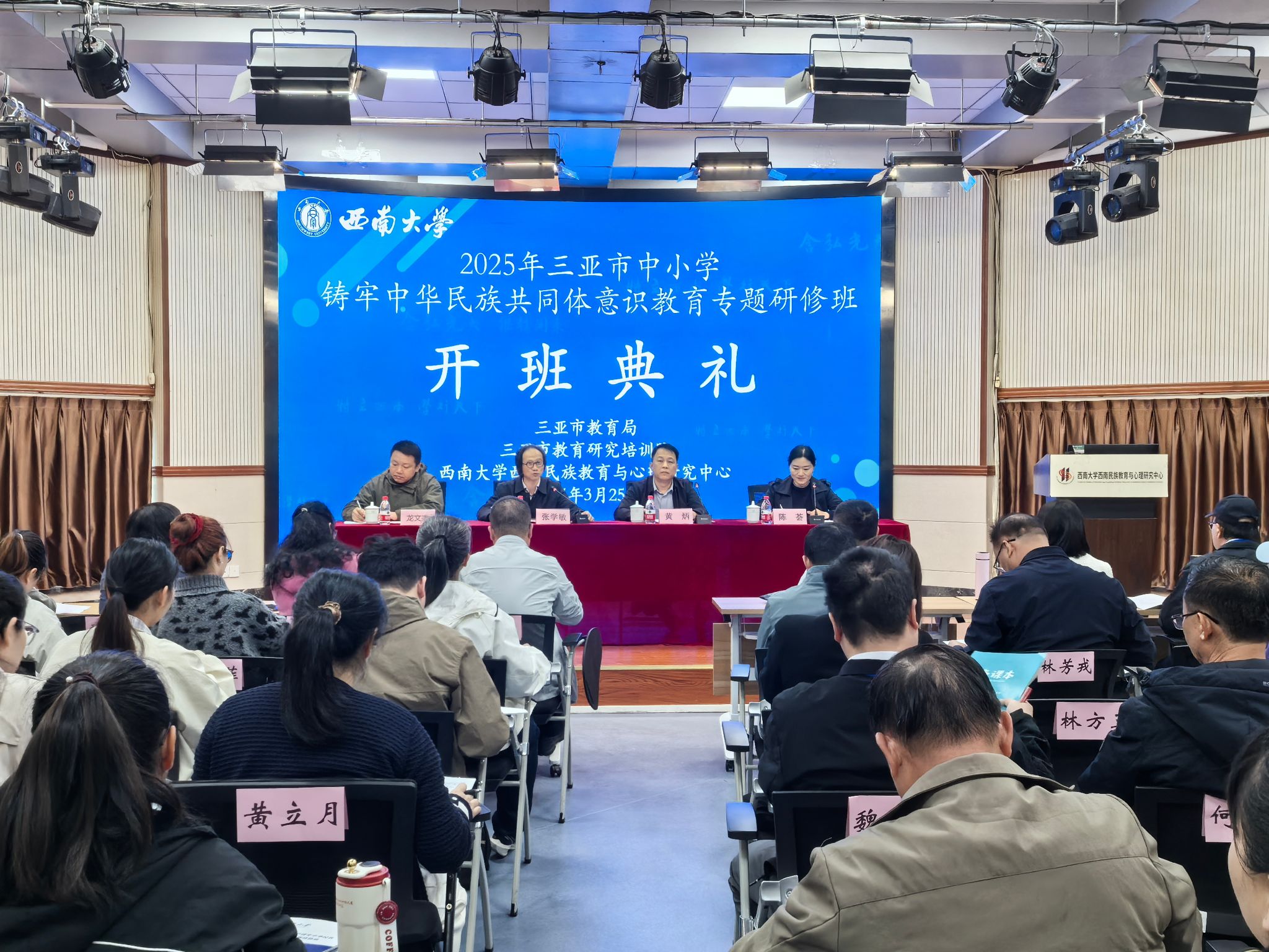 3月25日上午,由教育部人文社科重点研究基地西南大学必赢优惠y272net(以下简称“中心”)承办的“2025年三亚市中小学铸牢中华民族共同体意识教育专题研修班”开班仪式在中心説乎斋201报告厅举行。三亚市教育研究培训院(以下简称“教培院”)培训中心黄炳主任,教培院教研员龙文杰同志,中心主任张学敏教授、中心主任助理陈荟教授,以及87名三亚市中小学教师出席仪式,仪式由陈荟教授主持。
