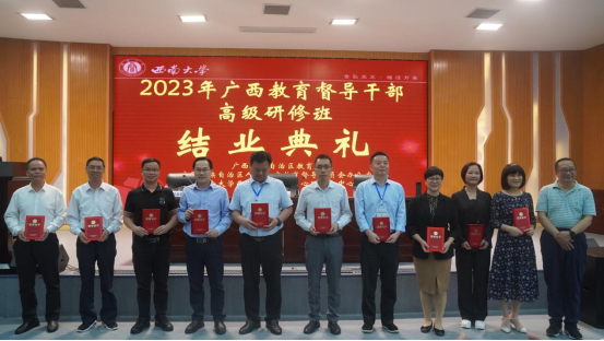 为期4天的研修,广西教育督导战线上的同志们充分展现了优良的学风、务实的作风,认真完成了理论学习和考察实践,此次研修取得了圆满成功。结业典礼上,宁耀教授和蒋立松副主任为优秀学员颁发了荣誉证书。全体研修学员参加了此次结业典礼。