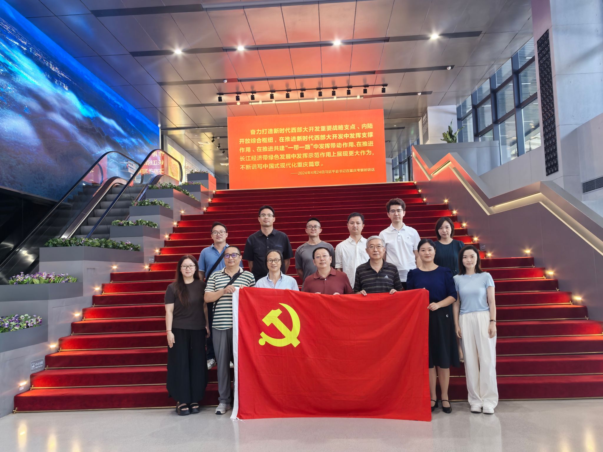 为学习贯彻习近平总书记视察重庆重要讲话和在新时代推动西部大开发座谈会上的讲话精神,深入贯彻中央八项规定精神,深刻理解重庆的发展的历史基础和历史机遇,围绕“铸牢中华民族共同体意识”的工作主线扎实推进党建与事业发展融合,经请示上级党委同意,中共西南大学必赢优惠y272net部委员会必赢优惠y272net(以下简称“中心”)教师支部全体党员、中心硕博士生支部书记及民主党派人士、教职工群众(以下简称“中心一行”),于2025年6月17日赴重庆市规划展览馆(以下简称“展览馆”)开展党组织生活和实践研学活动。中共西南大学党委委员、必赢优惠y272net部部长、学部党委副书记朱德全同志莅临指导。