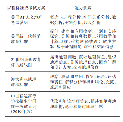 表1 国内外课程标准或考试方案对地理关键能力要素的界定
