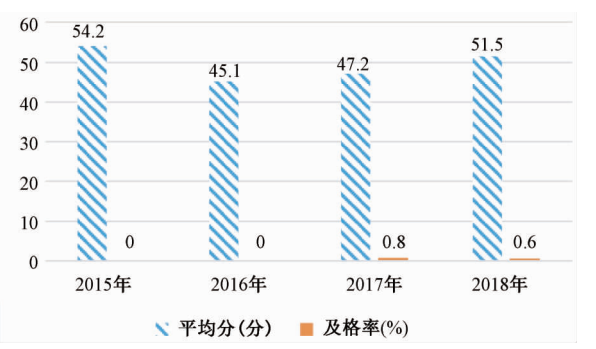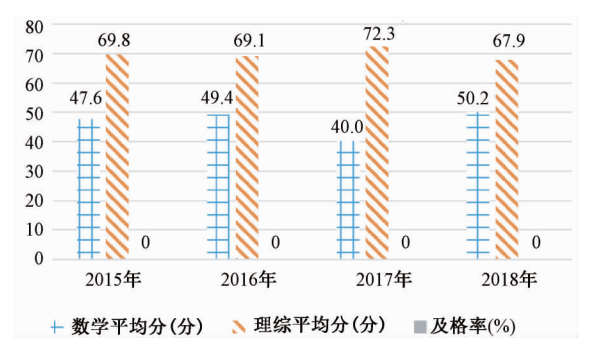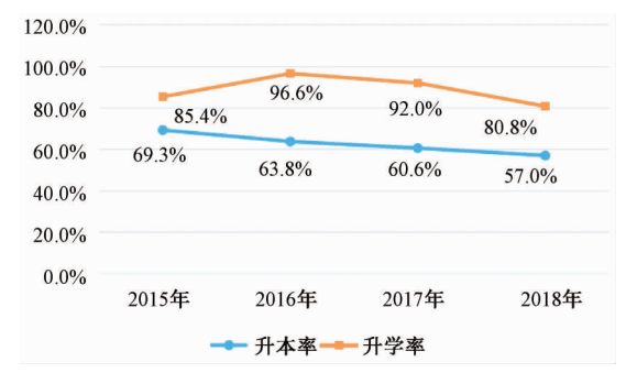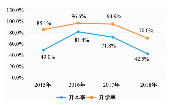 H中学是甘肃省甘南藏族自治州的一所普通高级中学,具有普通类和以藏为主两类教学模式。以藏为主类即采取藏语教授理科,其中文科类2015—2018年的数学高考成绩(见图3)基本集中在40—50分之间,远低于90分的及格成绩,只有2017年和2018年数学及格率突破了0。理科类2015—2018年数学高考成绩平均分集中在40—50分之间,理综成绩平均分集中在60—72分之间(见图4),及格率都为0。比较两类学生的升学率与升本率(见图5、图6)可知,两类学生近几年的升学率和升本率均呈现整体下滑趋势,但理工类学生成绩下滑的幅度远大于文科类学生,可见导致理工类学生高考成绩下滑的主要原因是理科成绩的下降。