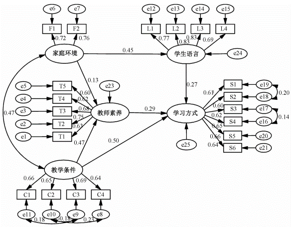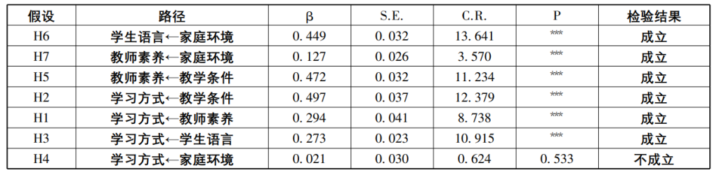 对得到的最终模型进行分析,所得各研究假设的标准路径系数值及其检验结果如表3所示。根据数据可得,家庭环境(β=0.449,P<0.001;β=0.127,P<0.001)对学生语言和教师素养具有积极的正向作用,教学条件(β=0.472,P<0.001;β=0.497,P<0.001)对教师素养和学习方式具有积极的正向作用,教师素养(β=0.294,P<0.001)对学习方式具有积极的正向作用,学生语言(β=0.273,P<0.001)对学习方式具有积极的正向作用,说明假设H1、H2、H3、H5、H6、H7均成立。