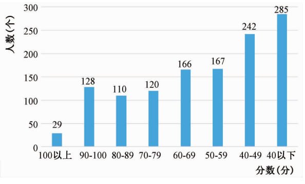 本次调研主要对1247位西藏及涉藏工作重点省中学学生的2019年春季学期期中数学成绩进行统计分析(见图1、图2),在满分为150分的数学试卷中,学生成绩90分以上的人数只有157人,及格率为12%。在不及格的学生中,50分以下的学生人数所占比重最大,占总人数的43%,可见学生的数学成绩很低,且不及格的学生主要集中在50分以下的低分段。