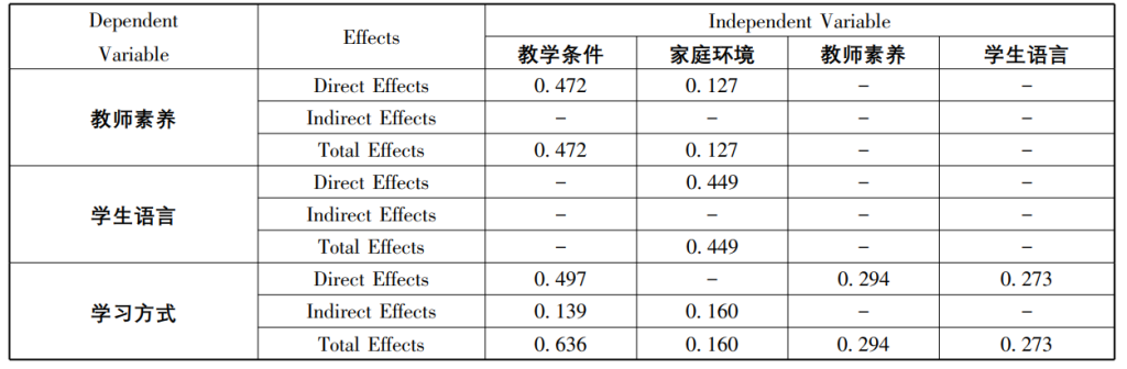 1.教学条件、教师素养、学生语言对学生学习方式有直接正向影响,且影响程度依次减小