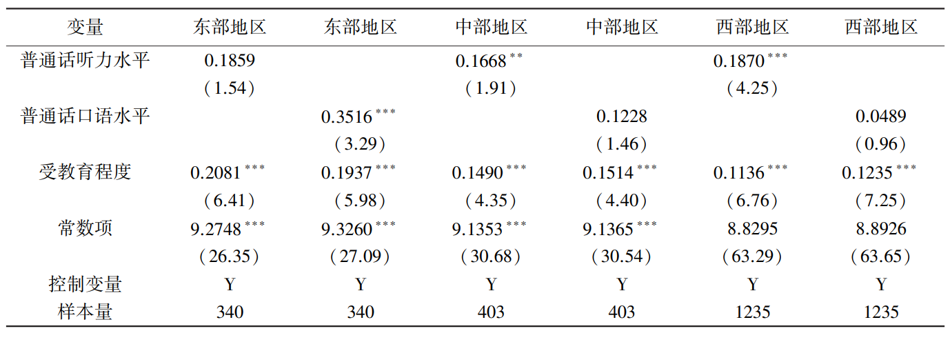 陈媛媛在研究普通话能力与收入的关系时,发现普通话能力在我国不同地区对劳动者收入的影响不同。[29]为探究不同区域普通话能力对少数民族劳动力收入影响的异质性,本研究将样本划分为东、中、西部三个组别进行分组回归,回归结果如表10所示。
