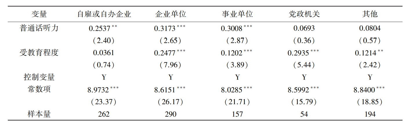行业分组回归结果表明,普通话能力在企事业单位、自雇或自办企业对收入具有显著的溢出效应,但在党政机关与其他行业并不显著。具体而言,普通话回报率在企事业单位的少数民族劳动力群体中最高,其中听力水平与口语水平对收入的影响系数分别达到0.3173、0.2026、0.3008与0.2404,这意味着普通话能力高的职员以增加人力资本存量的形式促进自身收入增长与职业成功。在自雇或自办企业中,受教育程度对收入的溢出效应并不显著,普通话听力水平对个体收入的影响系数为0.2537,远远高于受教育程度对收入所带来的影响。少数民族自我雇佣更多的是个人的自我选择,是由个体的机遇、能力、魄力所决定的,具有较高的主观因素,所以在自雇或自办企业,受教育程度对收入的促进作用并不明显。