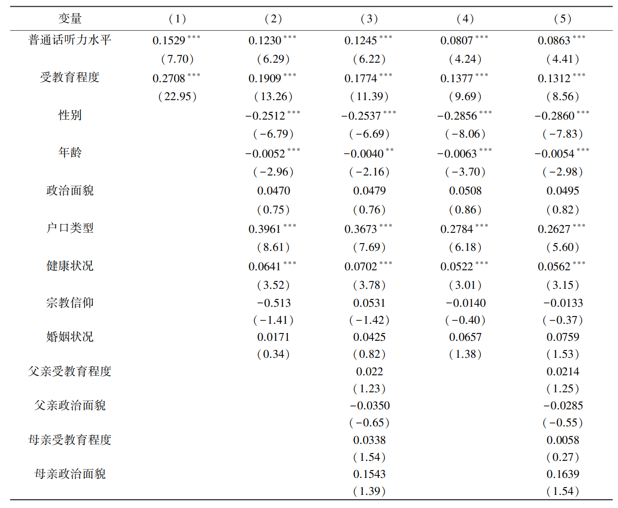 具体而言,第(1)列回归仅对核心解释变量(普通话能力与受教育程度)进行分析,结果显示普通话听力水平与口语水平的收入效应分别为0.1529与0.1227,受教育水平的收入效应为0.2708与0.2689。但由于回归中并未加入控制变量,普通话能力和受教育程度对收入影响系数的计算结果偏大,回归解释力度不足。