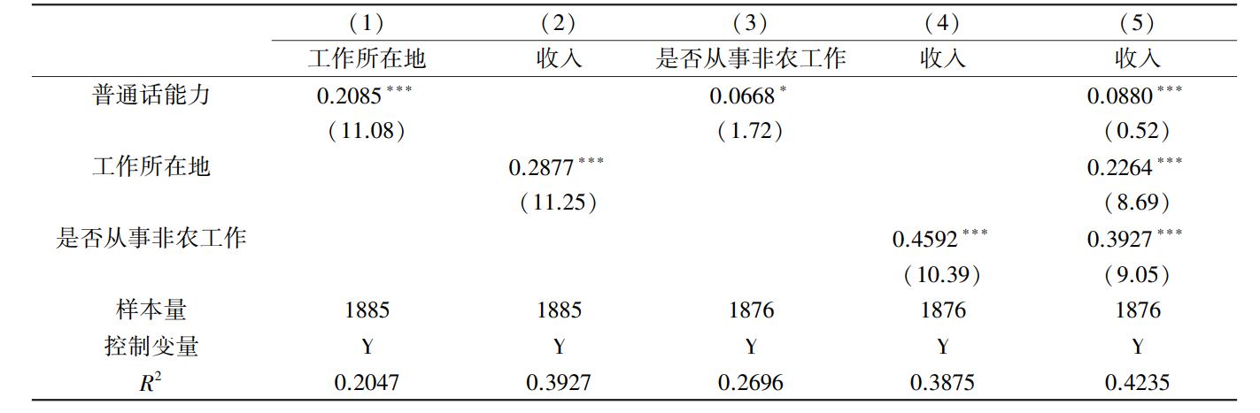 通过上文的理论分析可知,普通话能力的提升会通过促进劳动力在不同地区和行业之间的转移、提高劳动力资源配置效率,促进个体获得更高的收益回报。为考察这一传导机制是否成立,本部分将实证检验地区与行业的中介效应。为便于分析,将普通话听力水平和口语水平的平均数作为普通话能力,将单位类型划分为农业部门与非农业部门,以探究劳动力在不同部门、地区之间的转移是否是普通话能力提升少数民族劳动力收入的重要途径。