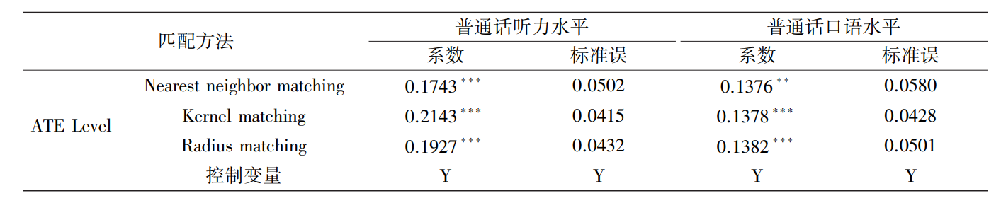 在实证分析中,除普通话熟练程度差异外,需考虑样本在其他层面上的异质性问题,以防止研究结论有偏。为此,本研究通过引入“倾向得分匹配”的方法来验证回归结论的稳健性。PSM是起源于鲁宾因果模型的匹配方法,通过匹配相似的样本来缓解内生性带来的影响。鉴于概率得分是PSM方法的匹配依据,在做PSM分析前,将普通话能力较强(普通话听力与口语水平在3级以上)的样本作为实验组,普通话能力较弱(普通话听力与口语水平在3级及以下)的样本作为对照组进行估计,分析结果如表4所示。