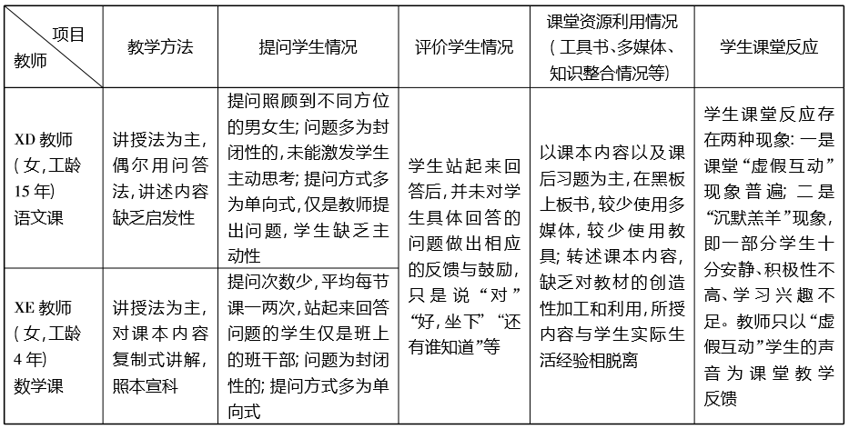 表2 XD和XE教师课堂教学整体情况