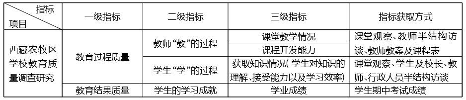 结合对教育质量的界定,以及冯建军教授⑤对“教育过程质量指标”[14]的划分,本研究制定了考察农牧区学校教育质量的三级指标,具体考察指标以及获取指标的方式如表1所示。