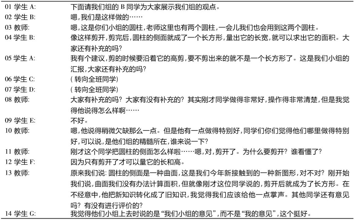 为了解决教学难点,教师采用了小组活动、汇报展示的方式,在重心下移和开放互动中解决教学难点——圆柱体的侧面积,那么,这一互动过程是否解决了教学难点呢?表2呈现了小组活动中的汇报展示过程。