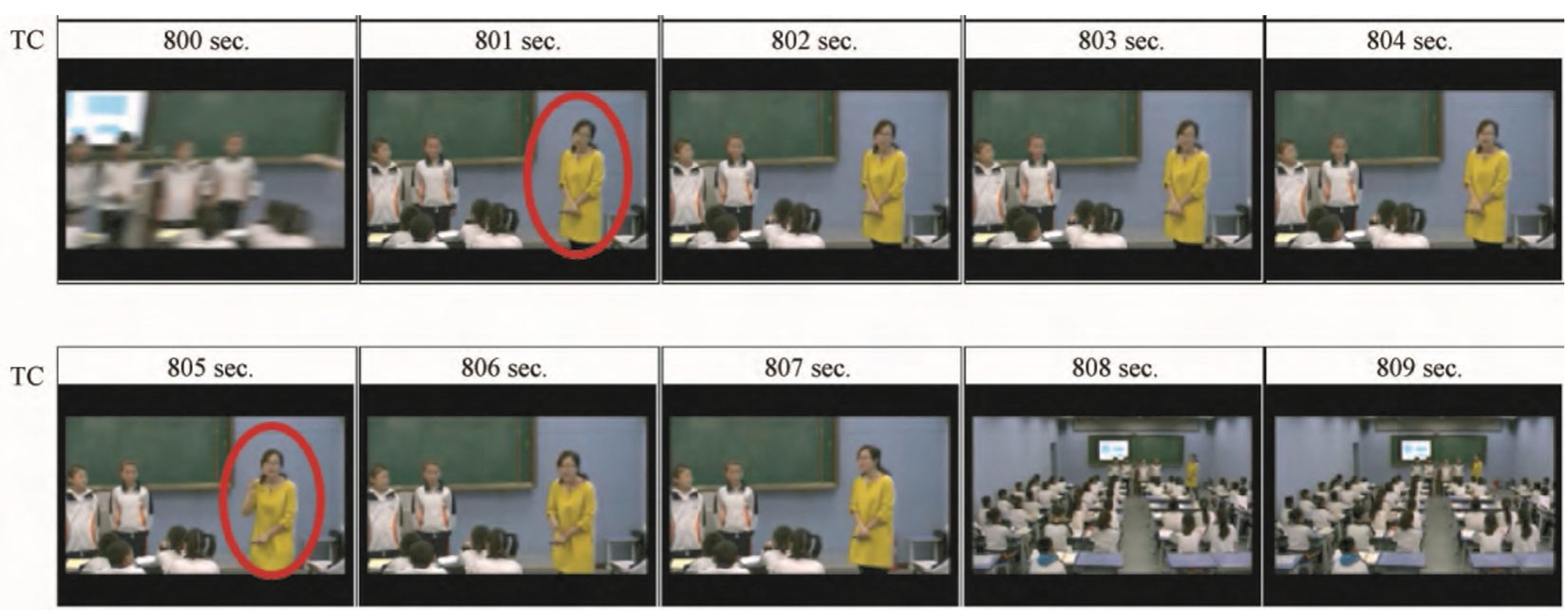 第二,教师的身体姿态构成了互动中具有转折意义的情境化线索。在教师的身体姿态中,第801秒(图5)和第805秒(图6)具有转折作用,是处于过渡阶段的关键序列,通过图5中的捏合手势,教师转变了此前的郑重式身体姿态,转而进入略显轻松的身体姿态,在捏合手势之后,又恢复了常规的郑重式身体姿态,主要特征是身体前倾、手势也是以郑重闭合的强调式为主,主要表现为指引、展示、强调和陈述等身体姿态,例如,在捏合手势及简短的“是否”评价之后,教师做出了指引和展示的手势(图7),将小组互动的主角转换到自己身上,开启了教师自身、小组成员和其他学生之间的下一轮互动,也实现了由“选择引导”转换为“事实引导”,即由引导学生做出是否的判断转换成引导学生列举事实。图9序列中展示了教师的多重身体姿态,包括展示、强调和陈述,由“事实引导”进入“思维引导”,引导学生对某个观点做出解释。