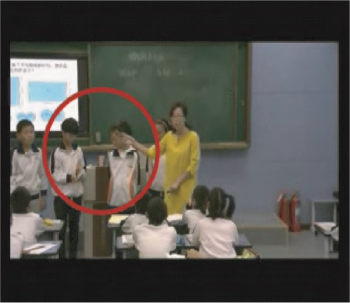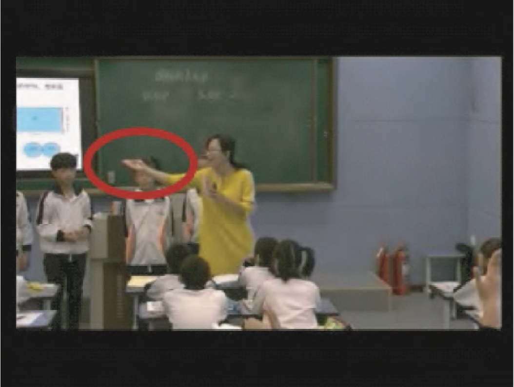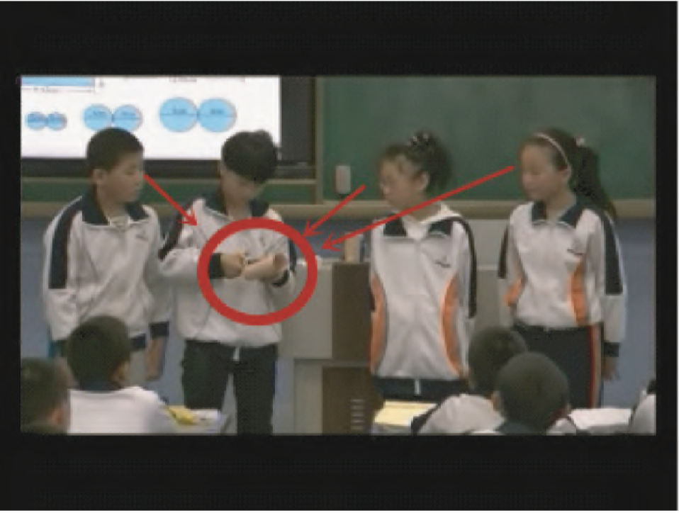 但是,透过具体图像,从“体态语与互动情境相结合”的角度来审视这段互动,原本旨在激发平等参与的互动却呈现出另一番场景:互动情境不仅区分了此次互动中的角色分配,同时也在表达、传递或生成一种身份上的区分——“优生”与“差生”:作为“优生”的小组成员,在展示本组观点的同时,也在向全体观众传达着身份上的优越;作为“差生”的小组成员,在互动中一直被老师和同组成员所忽略,但又在意他们的出场——因为只有他们出场,小组展示活动才是完整的,整个教学环节也才是完美的。