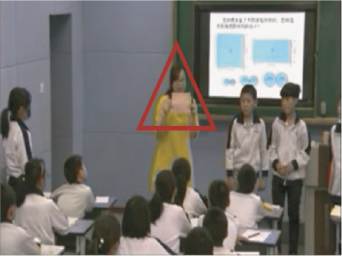 如果脱离了具体而微观的互动情境,这样的评价确实是成立的。当我们继续追问:学生如何在短时间内知道圆柱体的侧面积计算方法?当我们透过具体图像呈现出互动参与者的言语行为(如音调、停顿、重复、重音)与非言语行为(如身体姿态、眼神和手势、互动空间),这次课堂互动的“微观生态”被呈现出来,我们对这段互动过程也有了较为全面的了解。
