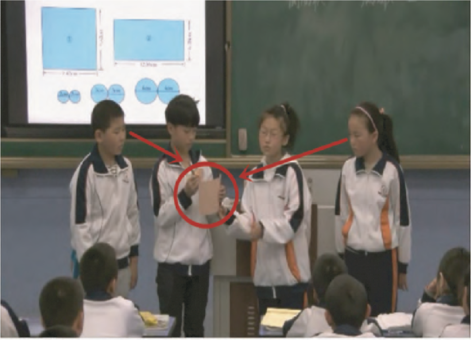 图16、图17是图14和图15两个序列中的代表性图像,可以看出,中间的两位同学为此次活动做出了重要贡献:他们一边操作、一边表达了本组的观点,通过圆柱体、话语权、评价权的转移,他们及时有效地展示了本组重视民主的姿态,并因此受到了教师的表扬。相比之下,边上的两位同学为此次小组汇报展示活动做出了“牺牲”:他们全程没有说话,只是维持着单一的身体姿态,以中间两位主角为核心,主角手中的圆柱体则构成了他们的视觉焦点。面对这样的互动场景,我们不禁要问:既然边上两位同学全程不参与,为何还要作为小组成员参与汇报?是什么力量引导他们做出了这样的“牺牲”?