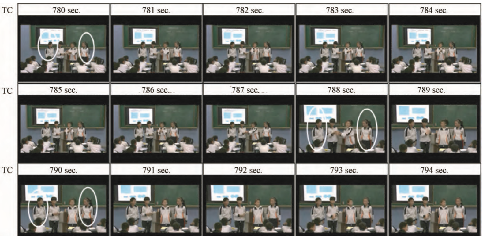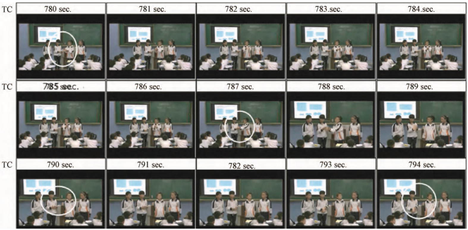 在选择视频和形式化阐释之后,继续根据视频图像的筛选标准,选取四类具体的图像进行分析:第一类,在整节课、整个序列中具有代表性的图像,其中的姿态出现频率较高(例如图1)。第二类,具有转换意义的图像,在所有图像中具有先行者的地位(例如图2)。第三类,具有关联意义的图像,在不同互动要素之间架起桥梁(例如图3)。第四类,具有“强反差性”的图像,呈现出与其他互动完全不同的内在结构(例如图4)。