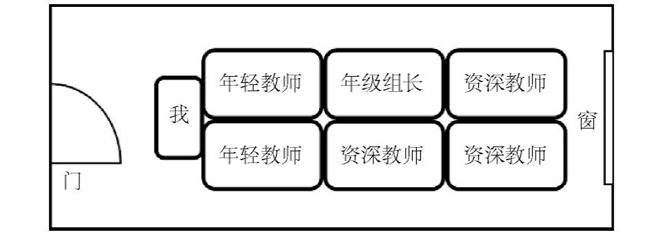除了空间位置的选择,我还观察到,年纪最轻的教师在办公室聊天中发言最少。不仅如此,有时还会出现最年轻的教师说话之后没有人接话的尴尬沉默。但是,只要资深教师或年级组长讲话时,马上会有人附和。(“H老师”的田野笔记2018年10月30日)