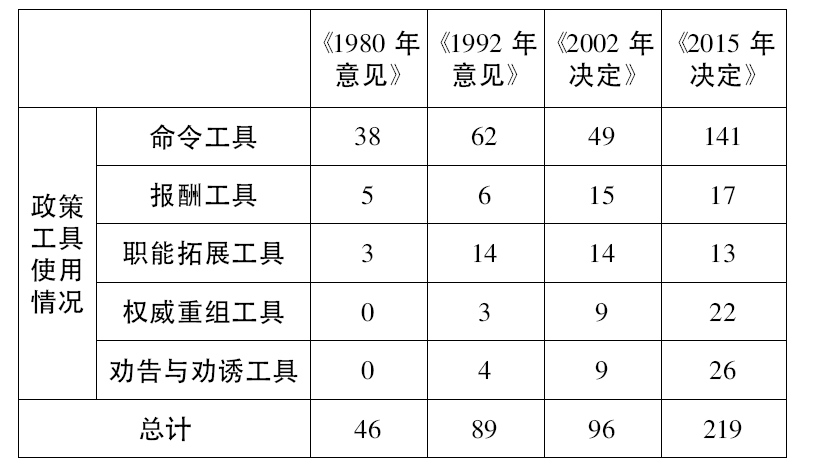 在麦克唐纳尔和埃尔莫尔的分析框架中,命令工具是指“规范个体和机构的规则,主要是对政策客体行为要求的规则和处罚”[2],关键词为要求、必须、落实、禁止、遵守等;报酬工具解释为“给予个体或机构货币(或货款)以交换其物品或服务”[2],关键词为资源、投入、待遇、工资等;职能拓展工具指的是“一种投资,主要目的是促使个体或机构实现其基本功能的永久性变化”[2],关键词有培养、教育和培训等;权威重组工具可以理解为“个体和机构之间转移正式权威的政策工具”[2],关键词为改善、管理、消除、改革、整改等;劝告与劝诱工具被认为是“一种信号,目的是力图改变人们的偏好和行动,其特点是论说性”[2],关键词为宣传、学习、鼓励等。