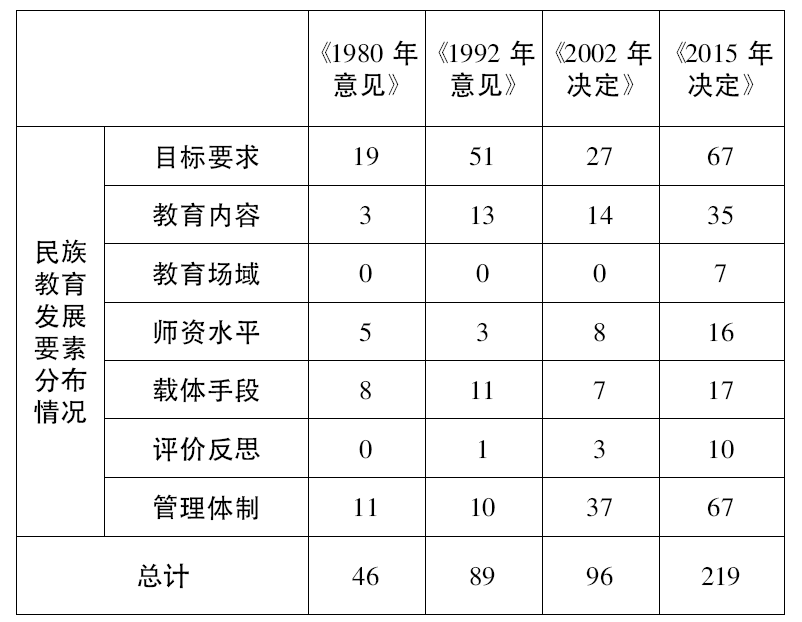通过教育政策工具和民族教育发展要素二维分析框架,在对4份政策文件进行分析后看出,我国民族教育政策的发展变化存在以下鲜明特点: