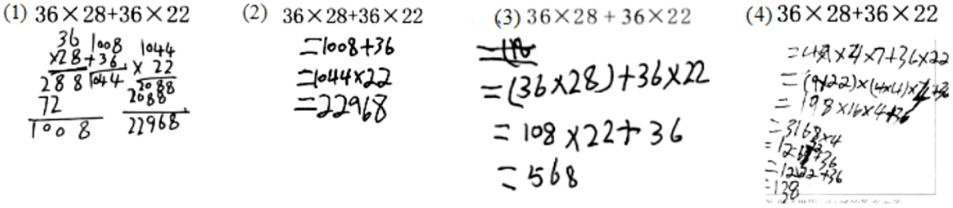 新疆大规模数学教育质量监测中发现,学生错误背后的原因较为复杂,绝非能用学生粗心来解释。[3]图2中,例(1)、例(2)题目涉及加法和乘法混合运算,但是学生仍按照加法法则“从左到右”进行计算。例(3)中,学生知道在混合运算中“先乘除再加减”,但是错误计算36×28,紧接着又乘错了对象,造成运算错误。例(4)中,学生先将36分解为4和9,28分解为4和7,但错误使用结合律,最终计算错误。