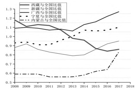 注:数据来源于2008—2017年全国和五大自治区统计年鉴以及五大自治区《国民经济和社会发展统计公报》