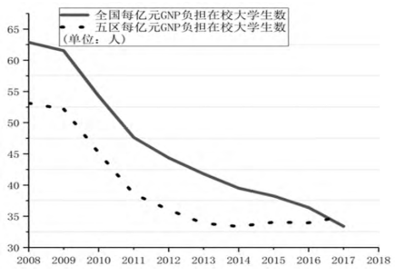 如果把5个自治区作为整体来看,其高等教育发展规模与全国平均水平的差距在逐渐缩小。如图5所示,与全国相比,2013年之后,5个自治区整体每亿元GNP负担高校在校生数下降速度趋于平缓,到2017年开始接近全国平均水平。