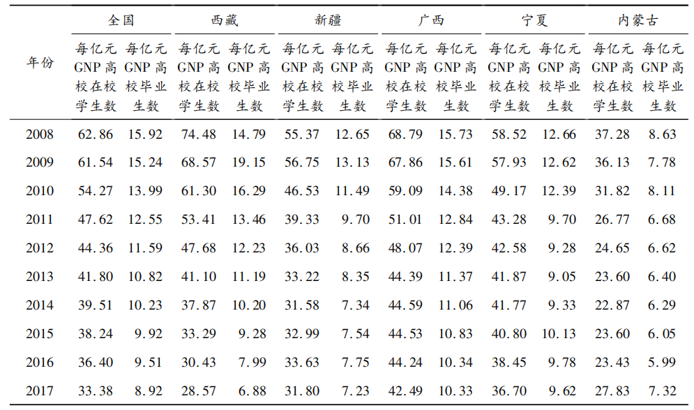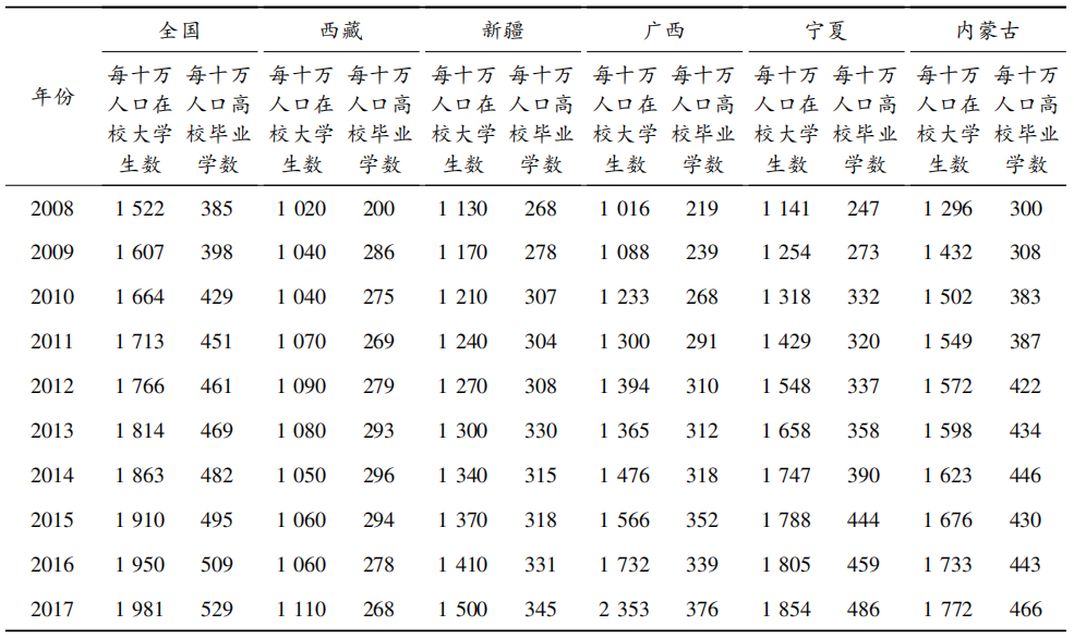 注:表中数据根据2008—2017年《全国统计年鉴》《西藏统计年鉴》《新疆统计年鉴》《广西统计年鉴》《宁夏统计年鉴》《内蒙古统计年鉴》整理。其中2014年《西藏统计年鉴》中的高校在校生人数包括研究生,本表做了剔除,以与其他几个自治区一致,只包括本地高校普通本专科生