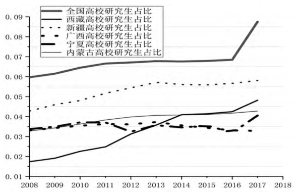 在高等教育进入大众化阶段后,研究生教育承担着高层次人才培养的重要任务。从2008—2017年,5个自治区在校生中研究生占比提升较慢,且与全国平均水平相差甚远(如图6)。