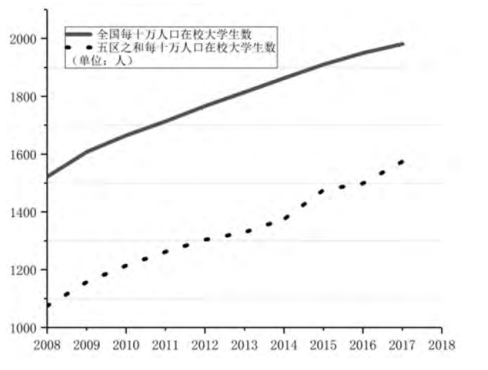 2008—2017年5个自治区高校每十万人口在校大学生数和每十万人口毕业生数与全国一样,都呈逐年递增趋势(见表1)。