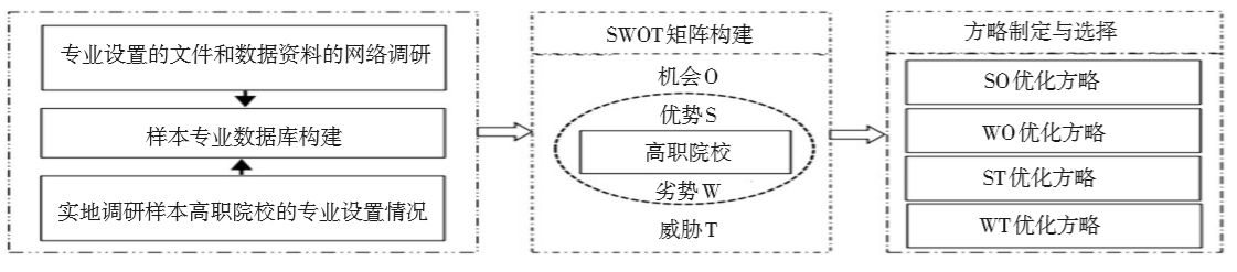 综上所述,本研究将首先深入分析民族地区高职院校专业设置的现状,内部优势、劣势和外部机会、威胁,进而分析得出民族地区高职院校专业设置过程中存在的实践困境,进而针对困境提出优化民族地区高职院校专业建设的具体方略,以期为民族地区高职院校专业建设提供启示与借鉴,不断提升其专业设置的科学性与合理性,促进民族地区高职院校社会服务能力的可持续发展。