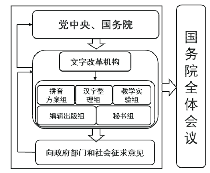 上述这一体系具有两个显著特点:第一,文字改革机构的工作直接受党中央、国务院的领导,其文字机构人员与中央领导循环互动,反复斟酌和打磨各种将要出台的文字改革方案,文字改革出版社为文字改革机构服务,宣传其方针、政策。例如,就汉字简化方案,毛泽东就做过两次批示;第二,文字改革机构拟订的草案获得中央领导同意后,立即向各相关政府部门和全社会征求意见,集思广益,对草案进行多轮讨论和修改,直至获得国务院全体会议正式通过。